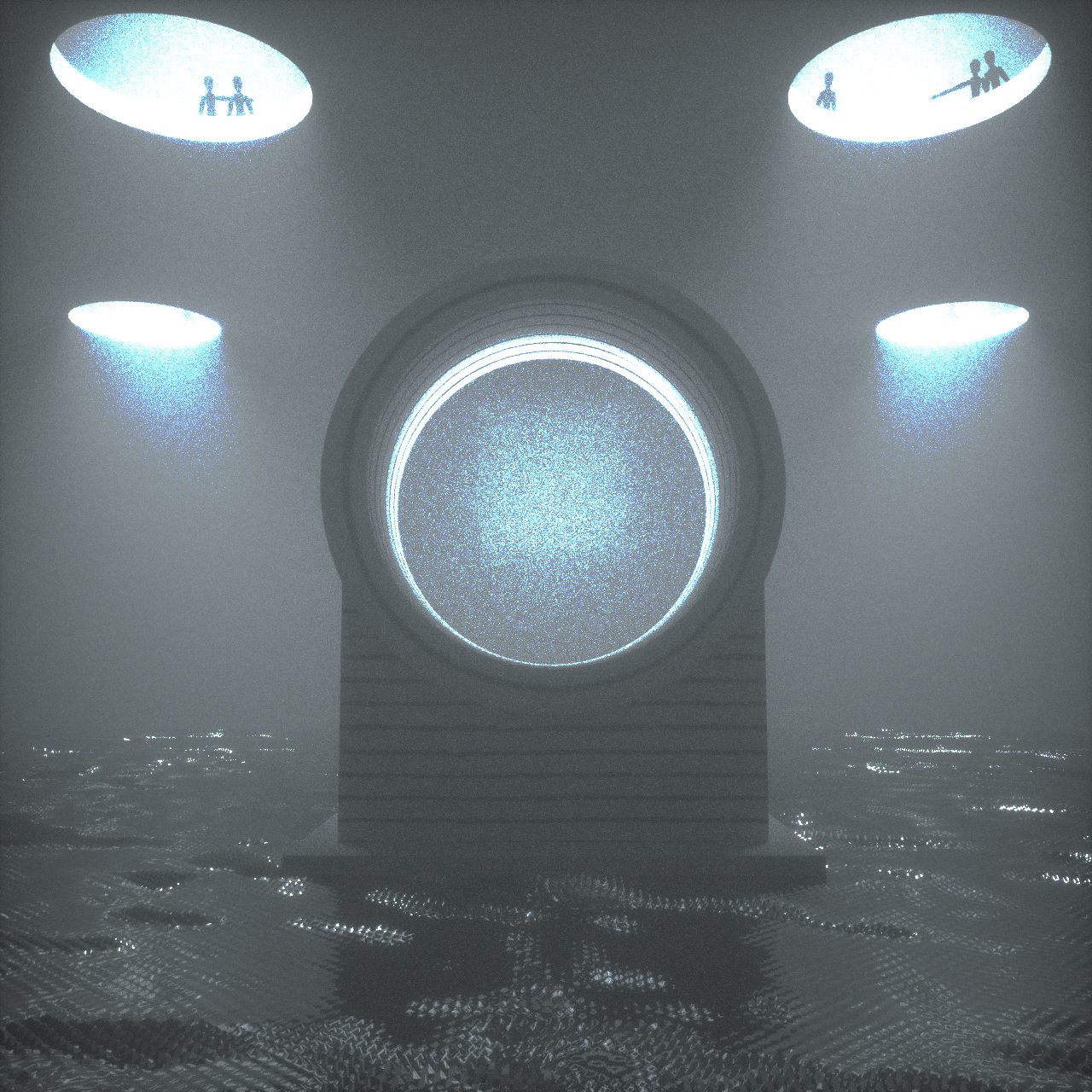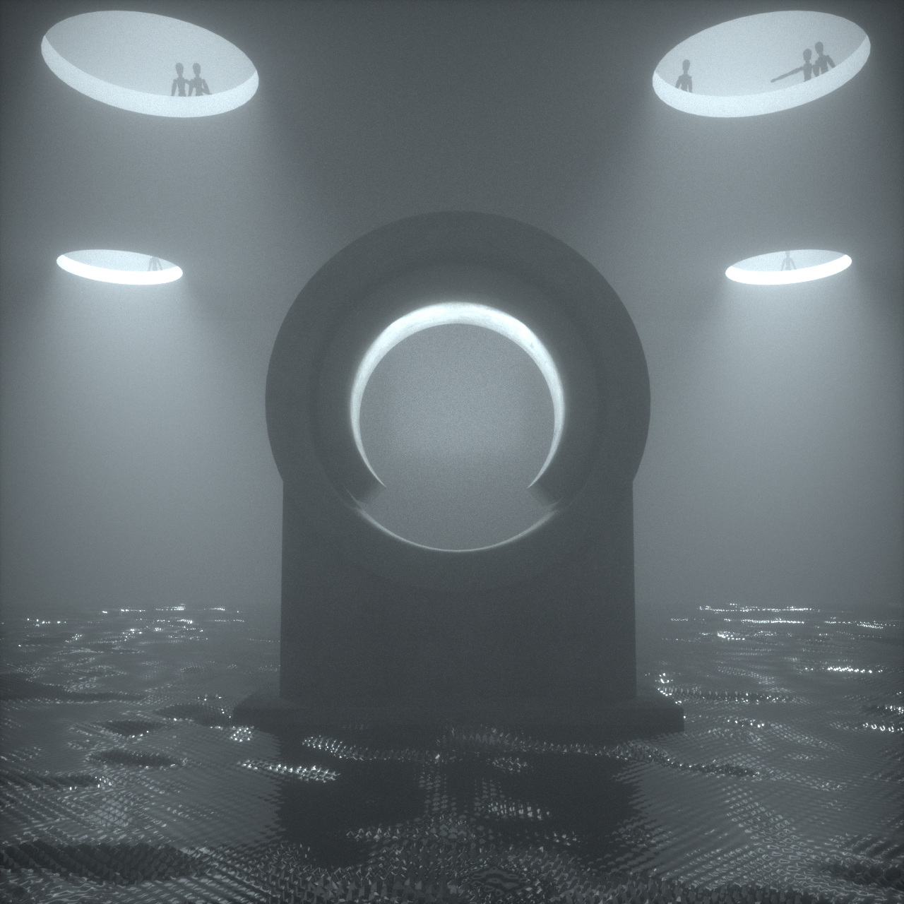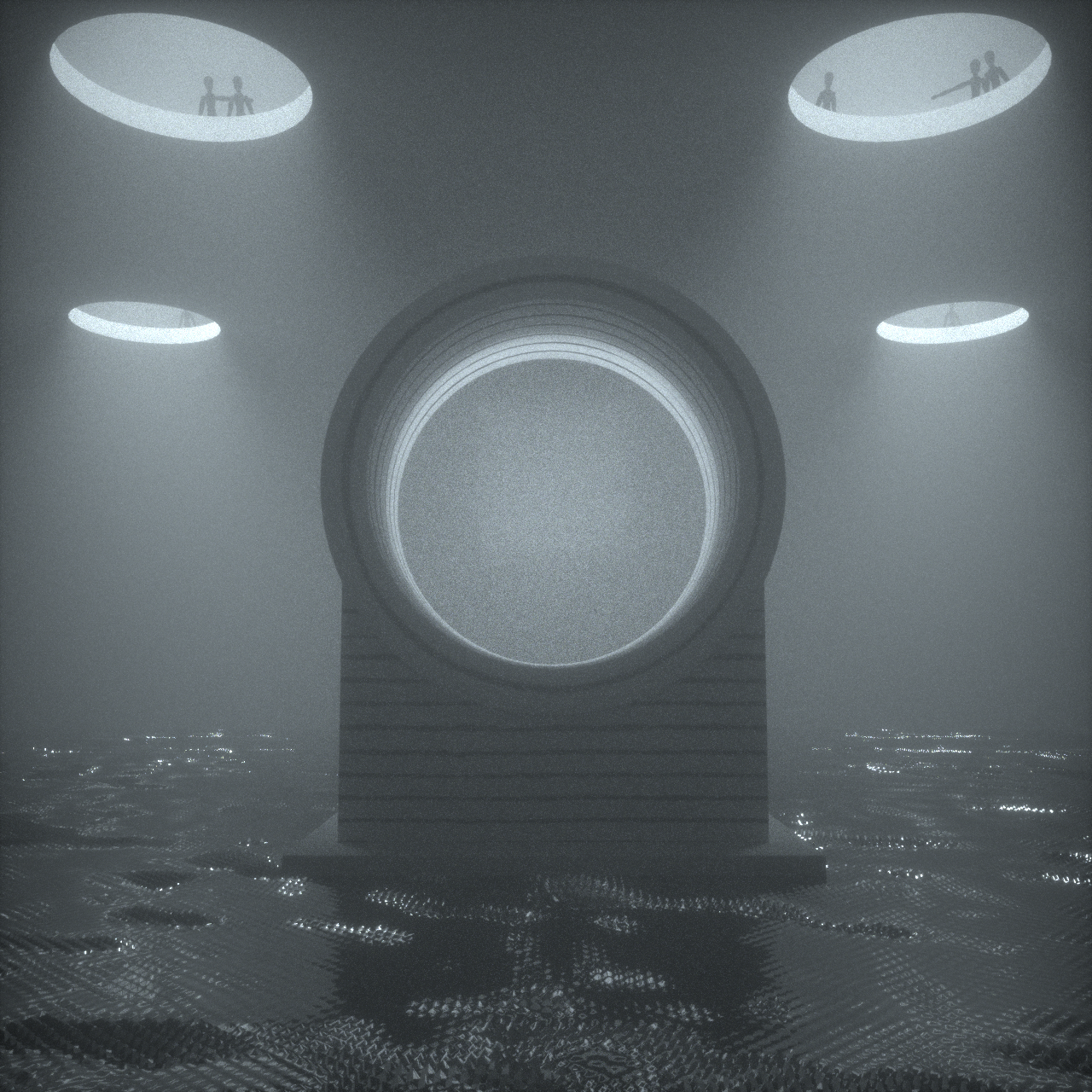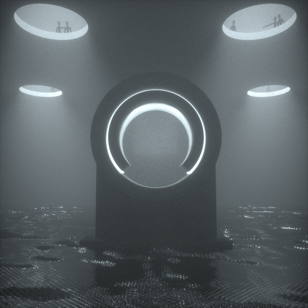 Iterations sent to the band in the early stages. Other members of the band weren't keen on the people looking down through the holes in the ceiling, so we opted to replace it with a heavy stormy sky to give the scene a sense of weight and atmosphere.