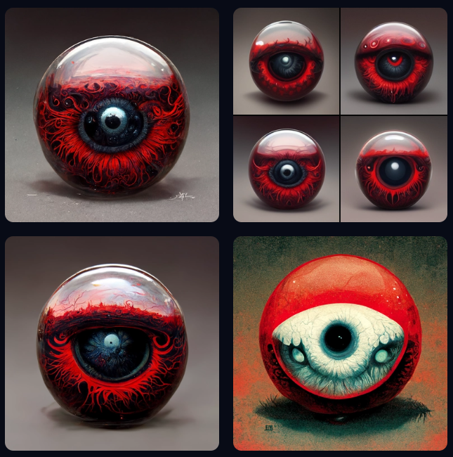 I also used Midjourney to generate a bunch of nasty looking red eyes to be my antagonist. I was super happy with some of these results and I almost wanted to make more than one just to use some more of the eyes. I finally settled on one particularly gnarly looking eyeball and put it together using the previously mentioned techniques.